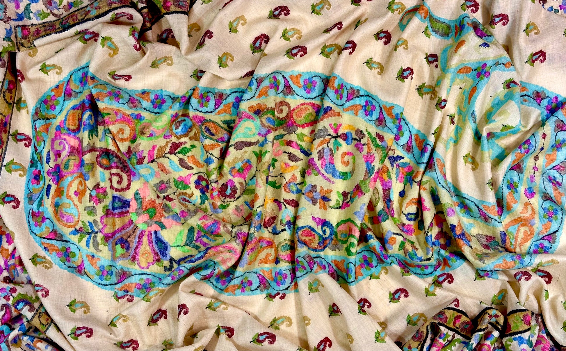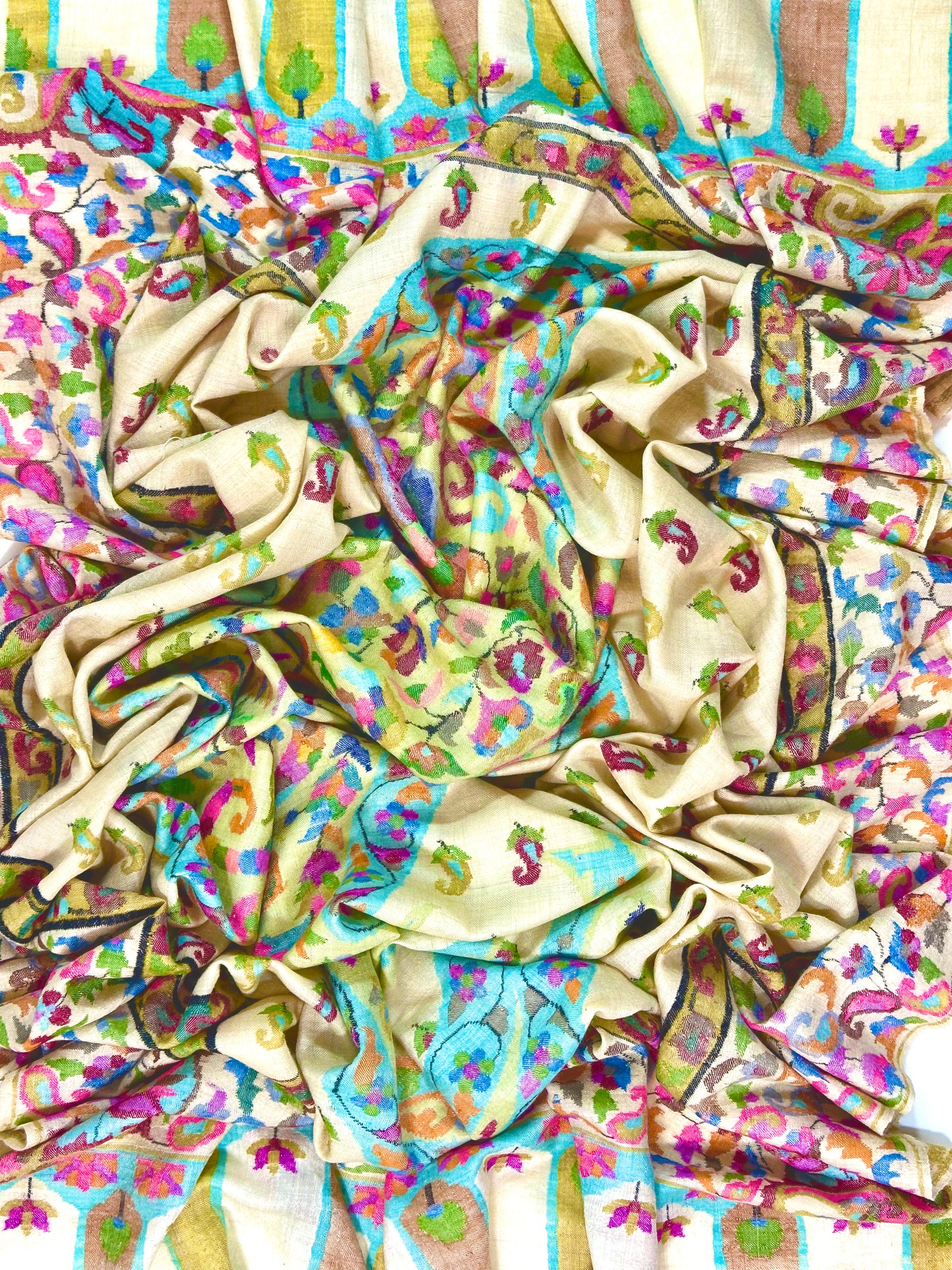 Each shawl is entirely handwoven using small wooden bobbins known as kanis, following a coded design script passed between generations. Unlike printed patterns, every motif is woven into the fabric, thread by thread — the result is a textile with remarkable depth, clarity, and soul.